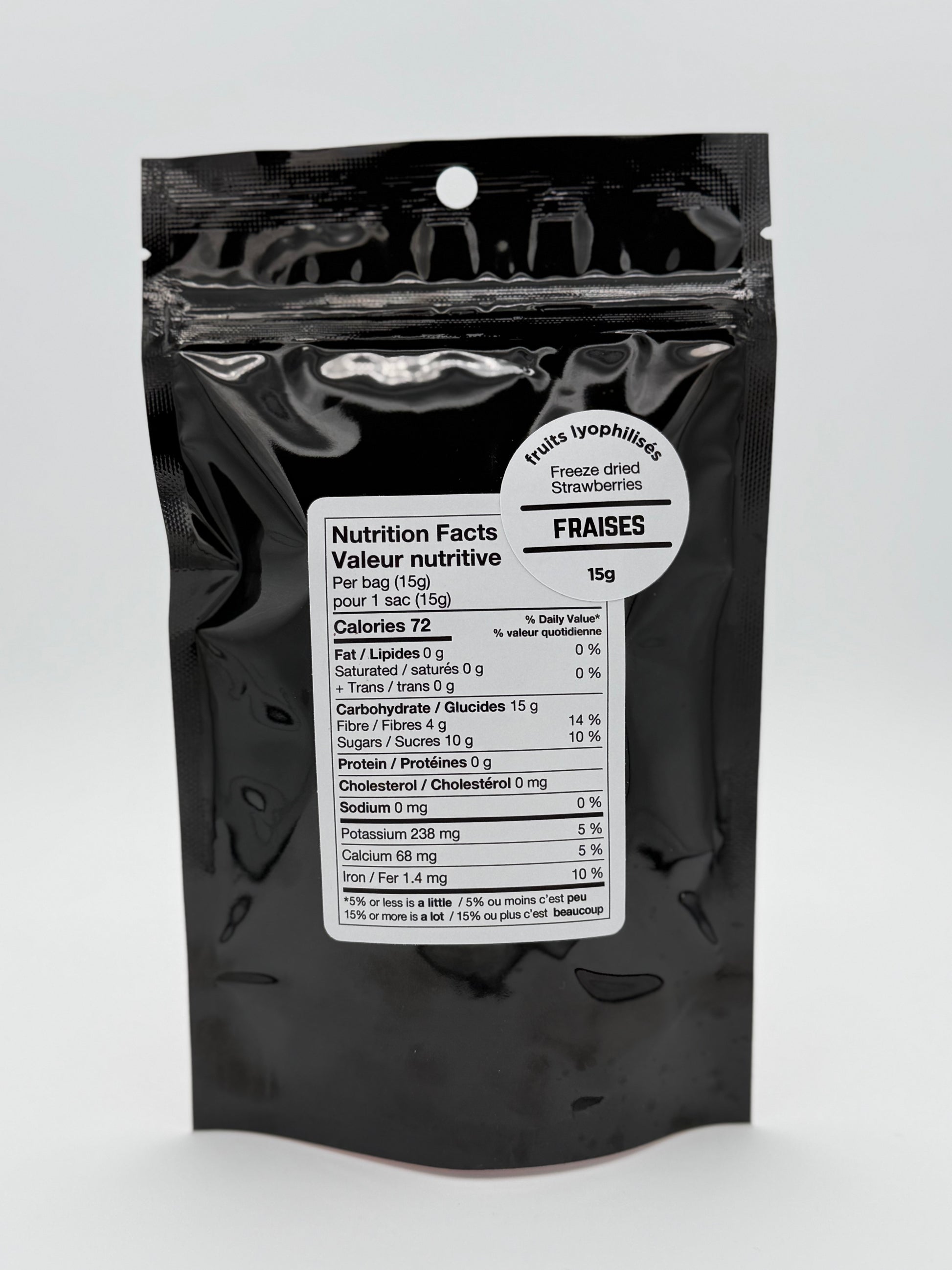 These freeze-dried strawberries are made in house, starting with ripe, peak-season fruit and nothing else. We freeze-dry them to preserve their natural sweetness, bright colour, and clean strawberry flavour, without adding sugar or preservatives.