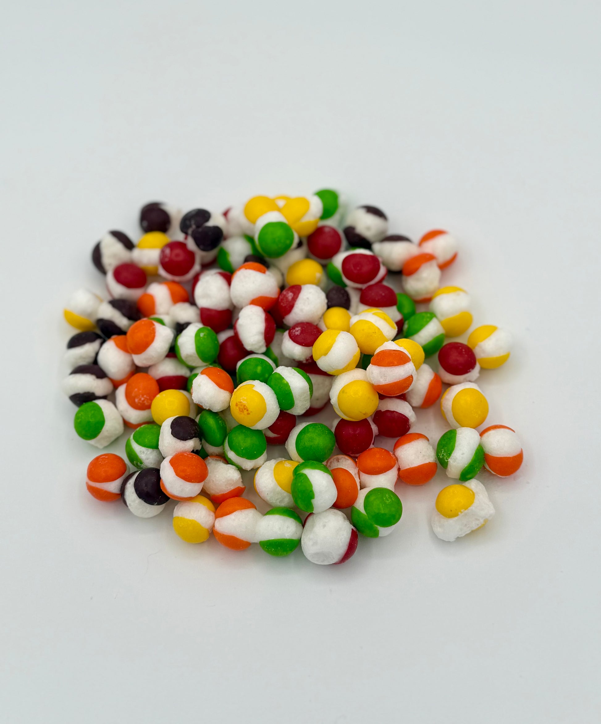 Our freeze-dried Skittles are made in house, taking the classic chewy candy and turning it into something entirely different. Through freeze-drying, the texture becomes light, crisp, and shatter-crunchy, while the flavour concentrates into a bold, unmistakable punch.